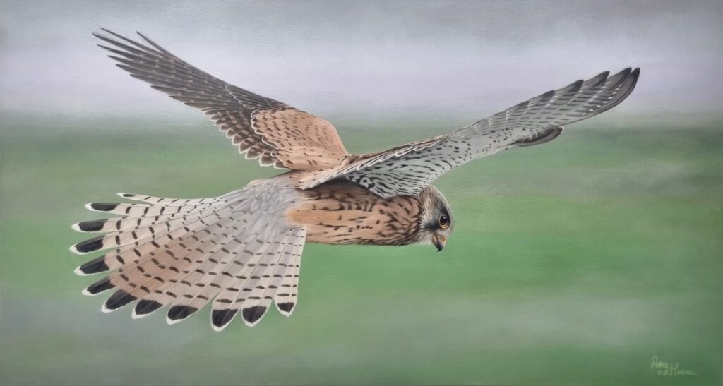 De voorbereiding voor dit project begon met het verzamelen van veel beeldmateriaal. Het meest bijzondere vond ik uiteindelijk in het fotoarchief van mijn vader: unieke opnamen van een biddende torenvalk, gefotografeerd vanaf een dijk waardoor de vogel van bovenaf zichtbaar is โ een perspectief dat niet vaak is vastgelegd. Deze fotoโs vormden wel een uitdaging vanwege hun beperkte scherpte. En dat is lastig als je een groot en realistisch schilderij wilt maken en geen toegang hebt tot materiaal van hoge kwaliteit. Daarom heb ik uitgebreid het verenkleed van de torenvalk bestudeerd met behulp van alle verzamelde beelden. Opvallend daarbij is de grote individuele variatie binnen het verenkleed; zo varieert de staartkleur van vrouwelijke torenvalk van diepbruin met brede donkere strepen tot wit met fijne strepen, of een verloop van bruin naar wit/grijs en alles daartussenin.
